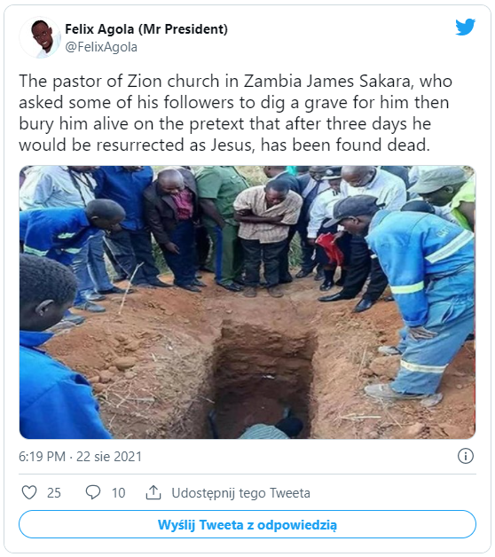 „Pewien pastor Chrześcijańskiego Kościoła Syjonu z Zambii [zielonoświątkowcy] zdecydował się na eksperyment, który nie miał prawa się udać. James Sakara, bo tak nazywał się ten 22-latek, przekonywał swoich wiernych, że jest w stanie dokonać tego, co Jezus Chrystus i on także może zmartwychwstać. Aby potwierdzić swoją śmiałą tezę i przekonać niedowiarków, zdecydował się przejść od słów do czynów.