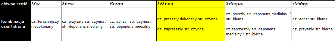 | 1 os. | λέλυκα | uwolniłem | 1 os. | λελύκαμεν | uwolniliśmy |
