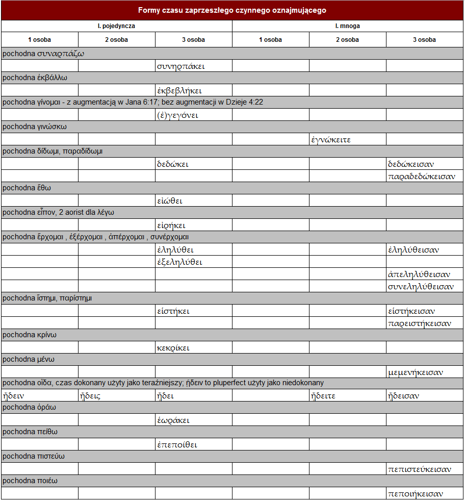 Ponieważ w Nowym Testamencie jest tylko 21 czasowników, które występują jako zaprzeszłe czynne oznajmujące, możemy je tutaj wymienić. Zwróćmy uwagę, że charakterystyczne ει występuje bez wyjątku we wszystkich, nawet w drugiej formie zaprzeszłej. W formach trzeciej osoby liczby pojedynczej może to wyglądać na końcówkę osobową czasu teraźniejszego czynnego oznajmującego. Tak nie jest. Pamiętajmy, że zaprzeszły pluperfect jest czasem wtórnym i dlatego ma drugorzędne końcówki osobowe, dla których nie ma zakończenia trzeciej osoby. Widoczne ει w formach liczby pojedynczej trzeciej osoby to litery form czasu zaprzeszłęgo czynnego bez dołączonych do nich końcówek osobowych.