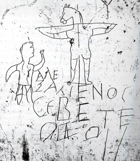 Z drugiej strony poganie gardzili Bogiem ukrzyżowanym. To, w jaki sposób upadły umysł postrzega wiarę w Jezusa Chrystusa, Boga Jahwe, który stał się człowiekiem, podsumowuje pochodzące z przełomu I i II wieku graffiti wyryte na murze Pałacu Cezarów na Palatynie w Rzymie, uważane za najstarsze znane pogańskie wyobrażenie żydowskiego Boga Mesjasza. Przedstawia ono ukrzyżowanego, nagiego człowieka z głową osła oraz podpis.