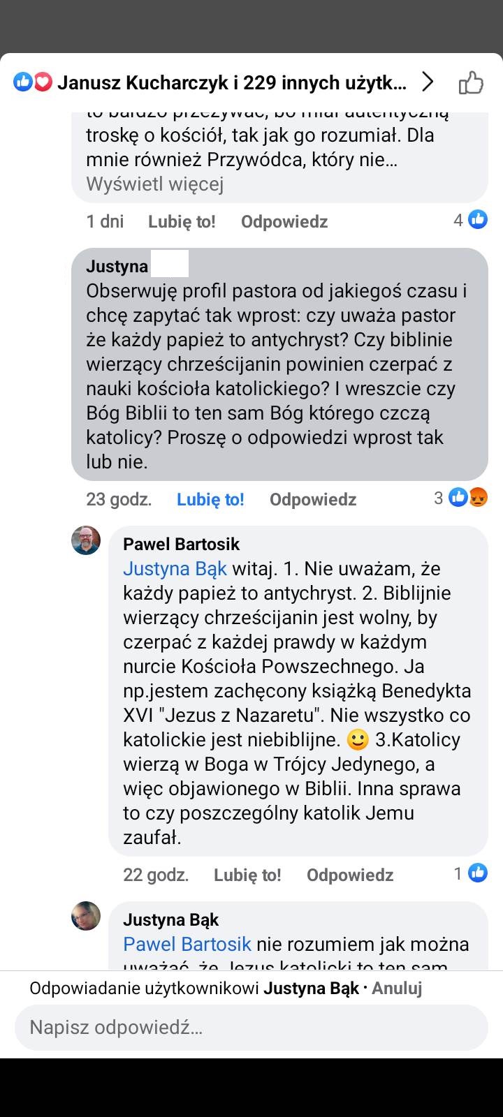 „1. Nie uważam, że każdy papież to antychryst. 2. Biblijnie wierzacy chrześcijanin jest wolny, by czerpać z każdej prawdy w każdym nurcie Kościoła Powszechnego. Ja np. jestem zachęcony książką Benedykta XVI „Jezus z Nazaretu”...” źródło