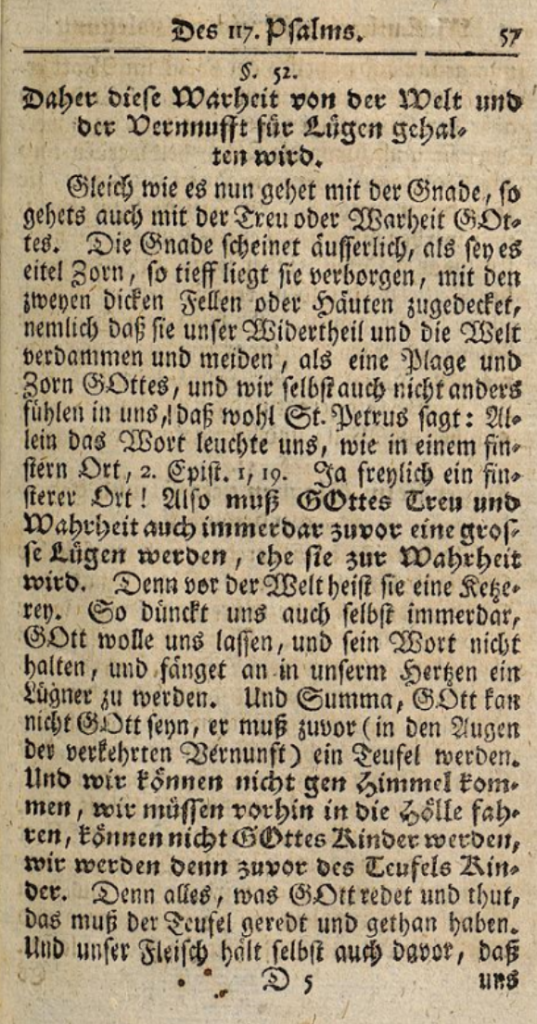 Ale znalazłem również link do pdf wcześniejszego wydania tego dzieła z roku 1744, które jest inaczej zredagowane, ma śródtytuły, a cytowany tekst znajduje się w akapicie 52, zatytułowanym „Daher diese Wahrheit von der Welt und der Vernunft für Lügen gehalten wird” (Dlatego ta prawda przez świat i rozum jest uważana za kłamstwo). Strona tytułowa wydania z roku 1744: D. Martini Lutheri Auserlesene erbauliche Kleine Schriften . Fragment cytowany przez ks. prof. znajduje sie w komentarzu do Psalmu 117 na str. 530. Luter komentuje tutaj Psalm 117 i pisze o nastawieniu nieodrodzonego / przewrotnego umysłu wobec łaski, wierności i prawdy Bożej. Pisze między innymi, że dla takiego umysłu: